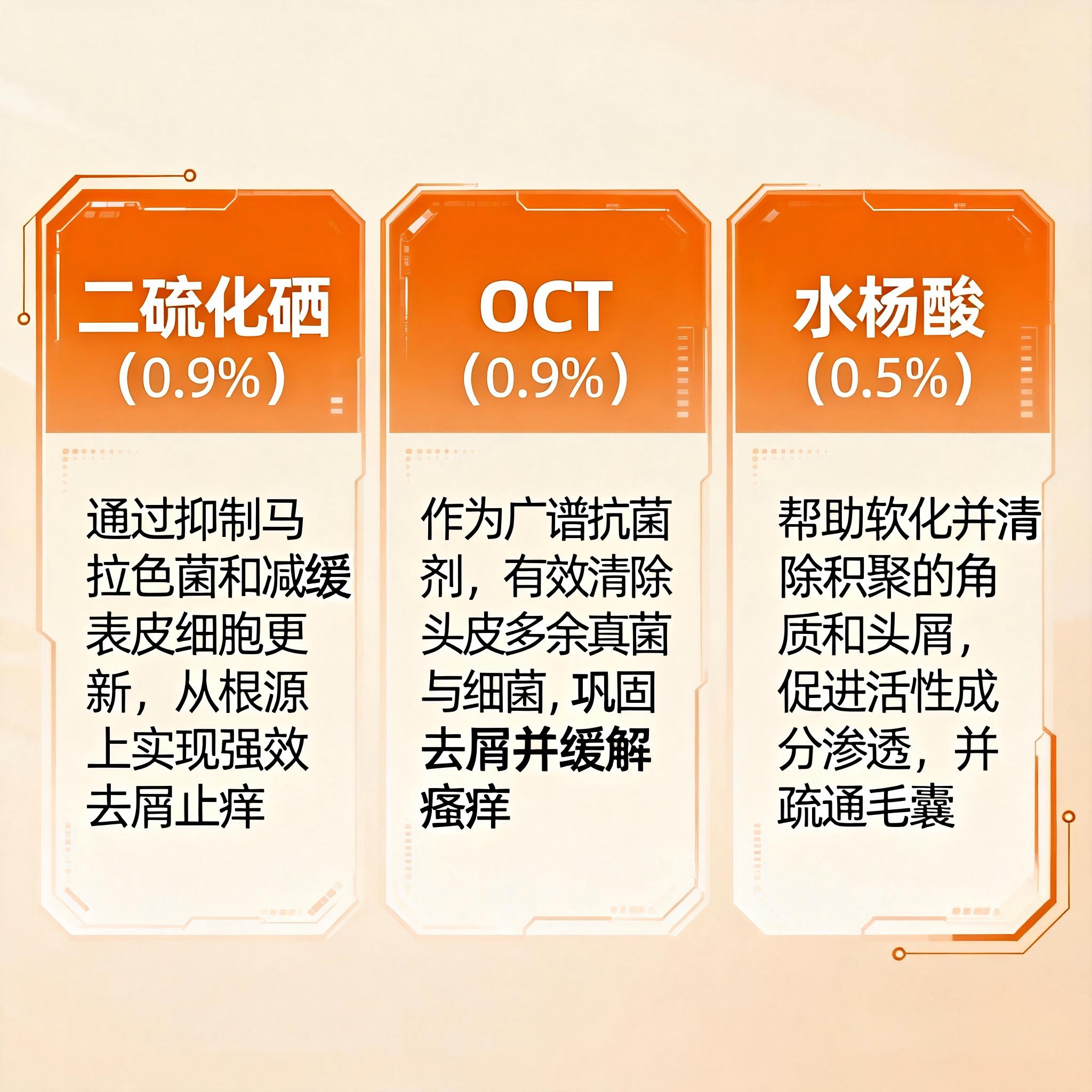 ·强力去屑组:二硫化硒(0.9%左右)、OCT(吡罗克酮去屑因子)——适合顽固头屑、油性头屑。0.9%属于温和有效浓度,既能保证效果,又避免高浓度刺激。