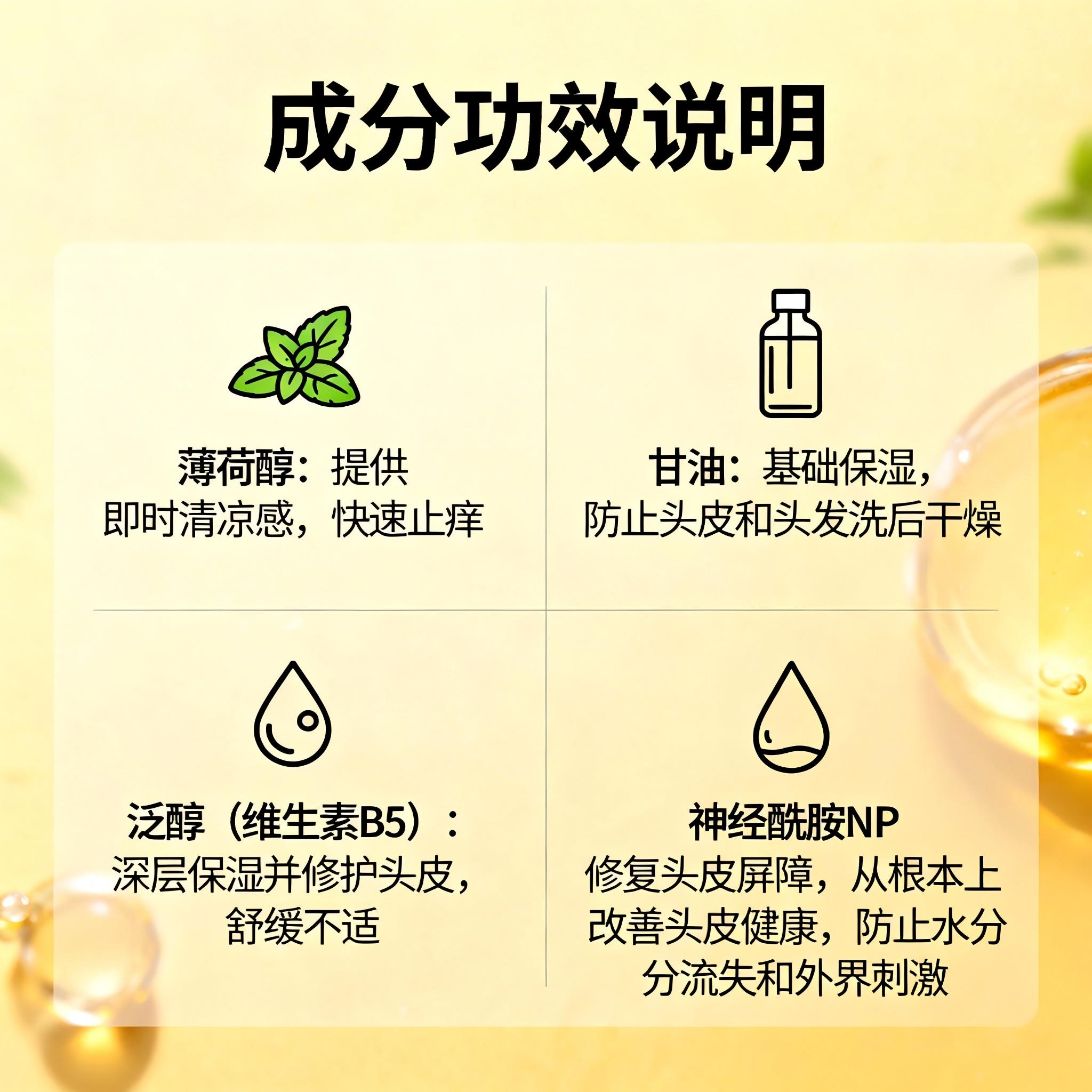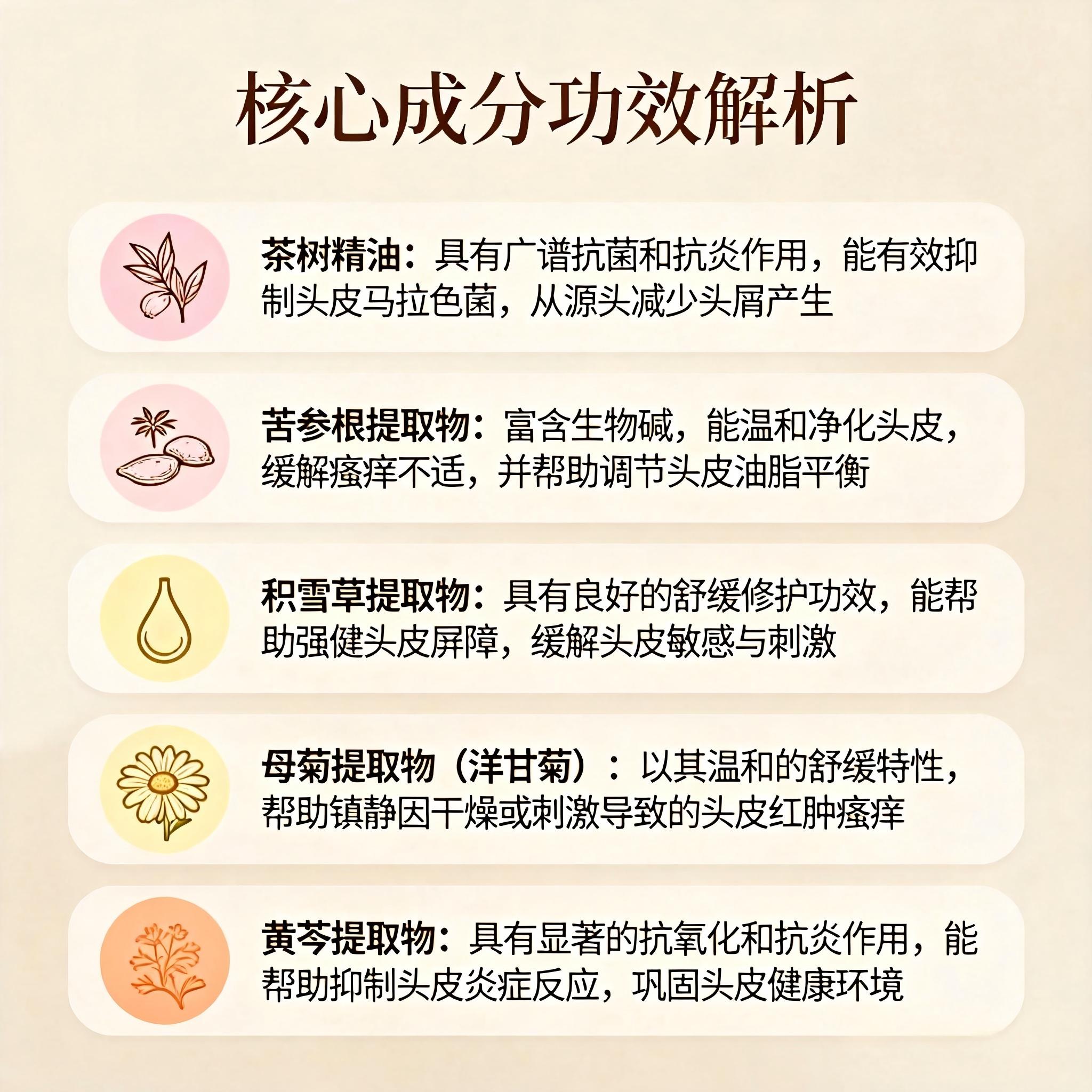 抗菌消炎组(茶树精油、苦参根提取物):抑制头皮有害菌繁殖,辅助缓解头皮炎症和瘙痒。