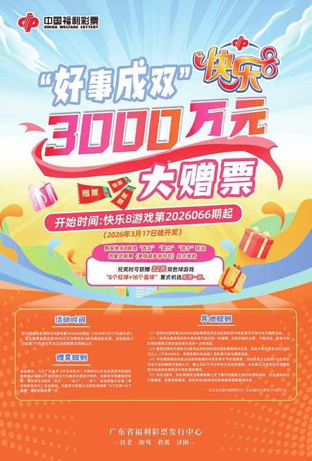 本次活动共安排3000万元赠票资金,自中国福利彩票快乐8游戏第2026066期(2026年3月17日晚开奖)起,至应赠票金额达到3000万元当期快乐8游戏期结后结束。活动结束之日起第7个自然日为本次活动赠票兑领截止日。