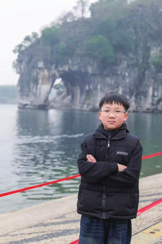 离开柳州,我们来到了山水甲天下的桂林。我终于亲眼见到了我的课本中的、妈妈童年里的象鼻山,它宛如一头巨象俯身饮水,栩栩如生,让我满心震撼。最让我难忘的是漓江竹筏之旅,景区规定一位成年人只能带一位未成年人,妈妈带着我们兄弟三人,眼看这场期待已久的体验就要泡汤,我心里失落极了。就在这时,两位善良的陌生人伸出了援手:一位小哥哥主动帮忙带弟弟,一位来自山东的兵哥哥热心地带我泛舟江上。我们一路上有说有笑,不知不觉便驶入了一幅流动的山水画卷。