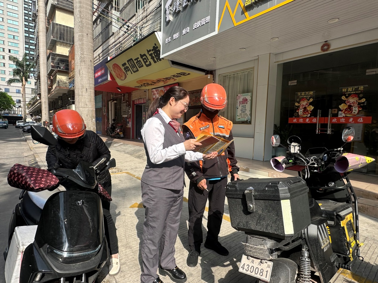 为深入贯彻金融为民理念,落实金融消费者权益保护教育宣传工作要求,广发银行茂名分行积极响应号召,聚焦“两司两员”重点关爱群体,将金融消保的触角延伸至城市最繁忙的神经末梢——针对外卖骑手群体,紧扣“清朗金融网络、守护安心消费”主题,开展了一场有温度、有深度的精准宣传服务,用专业守护为城市“摆渡人”筑牢资金防线。