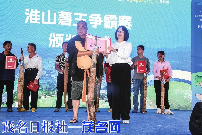 为获得曹江淮山薯王争霸赛冠军的选手颁奖。