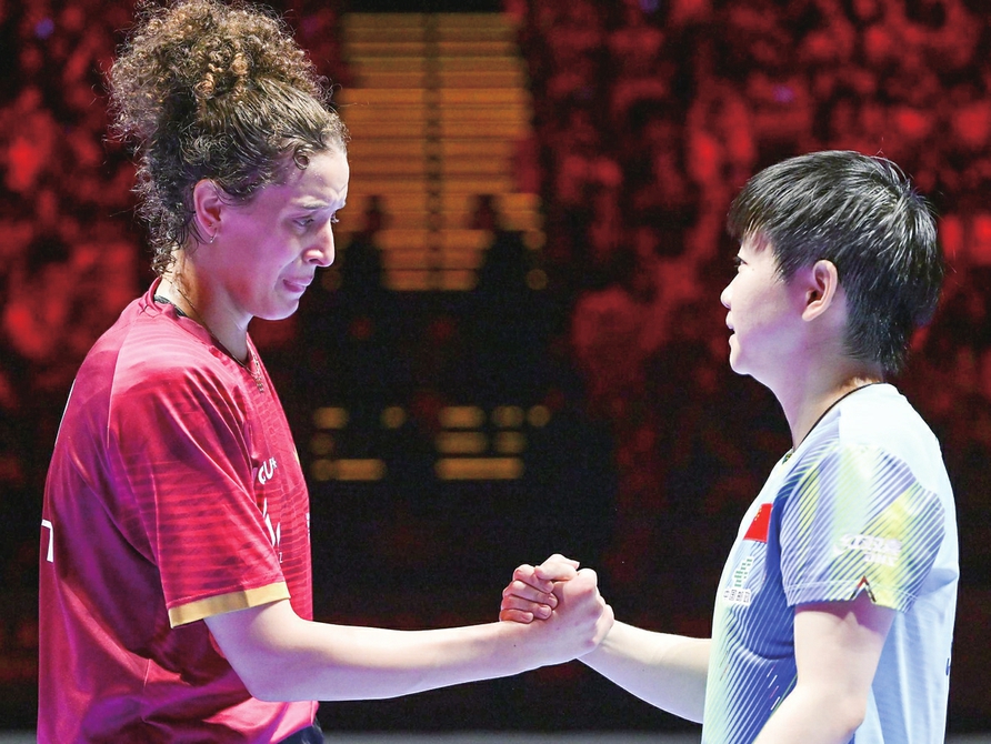 4月4日,汉娜·高达(左)在比赛后与孙颖莎握手。新华社记者 于洋 摄