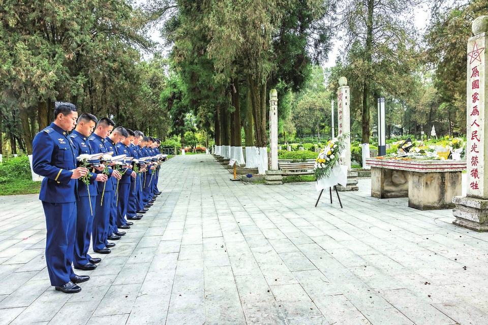 4月5日,贵州省安顺经济技术开发区消防救援大队消防员在安顺市烈士陵园缅怀先烈。新华社发(陈熙 摄)