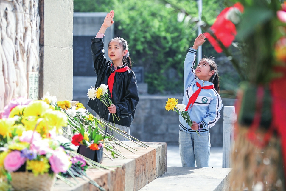 4月5日,在河南省焦作市博爱县烈士陵园,两名小学生在烈士纪念碑前献花时行少先队队礼。新华社发(程全 摄)