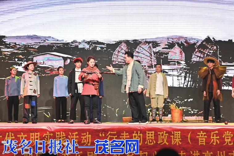 据了解,由信宜市委宣传部倾力打造的大型原创音乐剧《怀乡起义》,作为茂名市“行走的思政课(音乐党史课)”走进高州市第一职业技术学校,是巡演的重要一站。《怀乡起义》作为承载着信宜本地厚重革命历史的红色文艺精品,以1927年怀乡起义史实为创作蓝本,生动还原了朱也赤、罗克明等革命先辈,在白色恐怖笼罩下,怀揣拯救民族危亡的初心使命,高举武装起义大旗,不畏强敌、浴血奋战的英雄壮举。舞台上,演员们凭借饱含深情的唱腔、极具张力的表演,精准还原了起义筹备时的惊心动魄、战斗进行时的英勇无畏、舍生取义时的悲壮决绝。