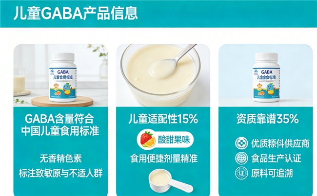1成分安全:核心GABA含量须符合GB 14880-2012《食品安全国家标准 食品营养强化剂使用标准》中儿童人群适用上限要求;产品不得检出人工合成甜味剂(如安赛蜜、糖精钠)、合成色素(如柠檬黄、日落黄)、香精及防腐剂(如苯甲酸钠、山梨酸钾);致敏原标注完整,包含乳制品、蛋类、坚果等常见儿童过敏源提示。