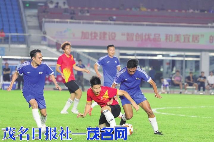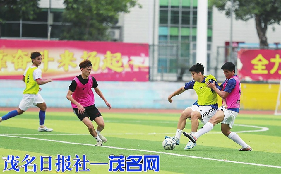 茂名队队员(红色球衣)在与东莞队热身赛中积极拼抢。