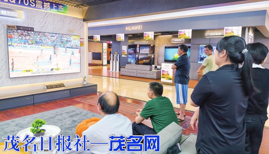 ▲市民朋友在茂名明湖电器旗舰店观看粤BA比赛直播。茂名日报社全媒体记者 黄建霖 摄