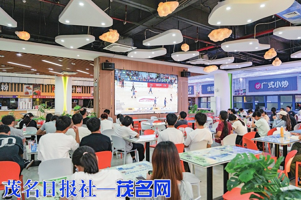 在广东石油化工学院食堂里,餐桌变成了“看台”,大屏全程同步直播赛事,众多在校学生围坐餐桌前,专注观看每一次攻防。“食堂大屏看球,比在宿舍用手机看更爽!”大二学生小陈和室友们占据了屏幕前最佳位置,桌上摆着饮料,彼此边观赛边交流:“我们平常也热爱打篮球,今天的比赛当是战术学习了。”每当茂名队打出精彩配合,食堂里便响起整齐的呐喊声,尽显少年热血。