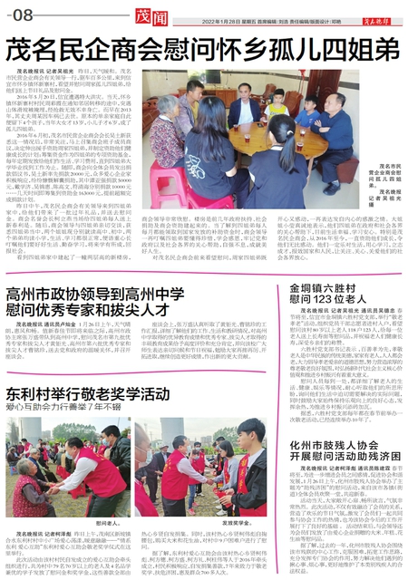 茂名晚报讯记者吴祖光 昨日,天气暖和。茂名市民营企业商会有关领导一行,驱车百多公里,来到信宜市怀乡镇怀新寨村,看望并慰问周家孤儿四姐弟,给他们送上节日礼品及慰问金。