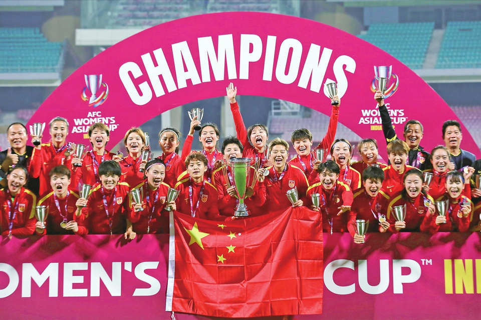 2月6日,中国队在颁奖仪式上庆祝。当日,在印度孟买举行的2022女足亚洲杯决赛中,中国队以3比2战胜韩国队,夺得冠军。新华社发(贾韦德·达尔摄)