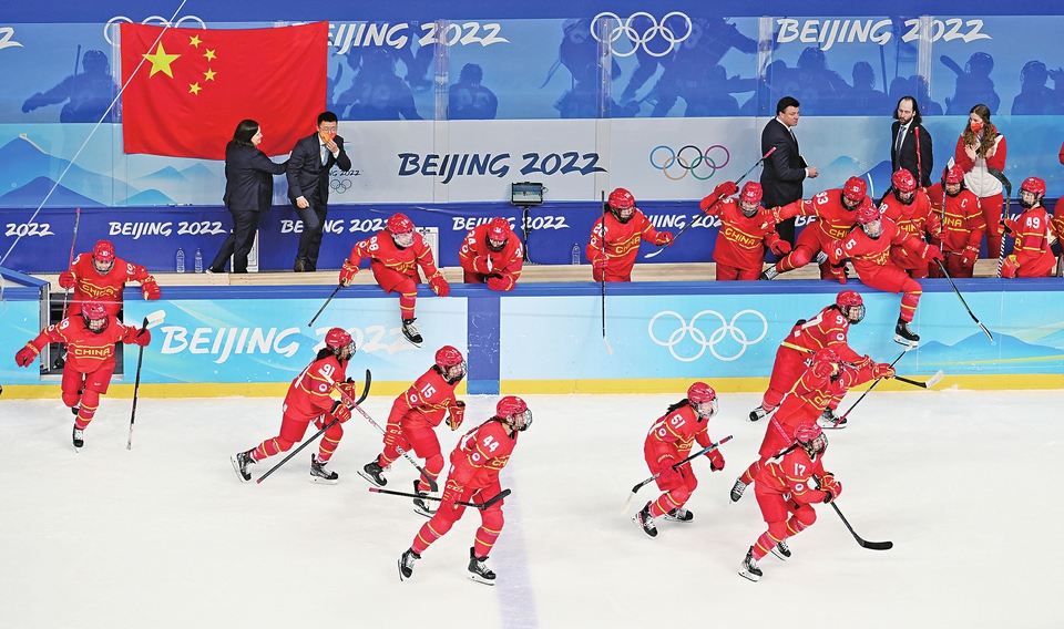 2月6日,中国队球员庆祝胜利。当日,在五棵松体育中心举行的北京2022年冬奥会女子冰球小组赛中,中国队以2比1战胜日本队。 新华社记者李尕摄