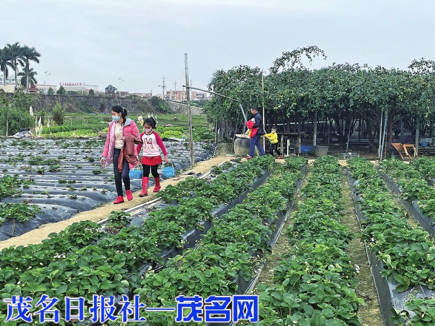 昨日是春节假期最后一天,在新坡镇东江村,市民一家大小开心摘草莓,享受快乐假期。茂名日报社全媒体记者李颜东摄