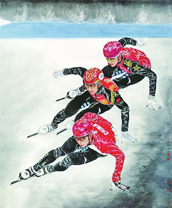“北京冬奥会点亮了象征着和平、友爱、光明的生命之光,给人类增添了拼搏的勇气、团结的力量和未来的希望。”作为参展艺术家代表,中国国家画院副院长于文江创作的《速度与激情》定格下中国短道速滑选手在赛场上奋勇争先的精彩瞬间。于文江表示,2022年北京冬奥会的举办是我们国家综合国力日益增强、国际影响力不断提升的重要标志。积极参与冬奥会、宣传冬奥会、助力冬奥会是艺术家们义不容辞的责任。“我们在此次创作中,本着守正创新的创作原则,力求生动、立体地诠释奥林匹克精神,用情用力讲好中国故事,谱写力与美的华章。”于文江说道。