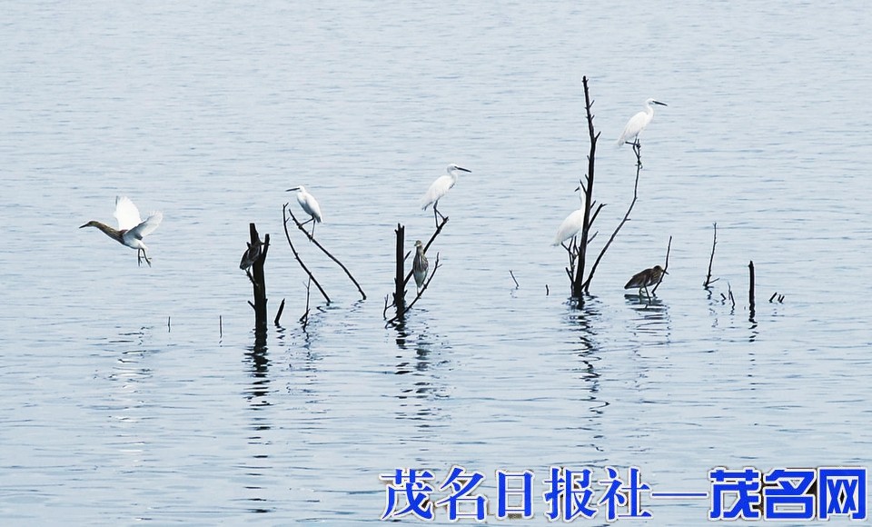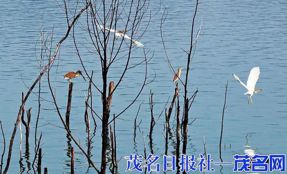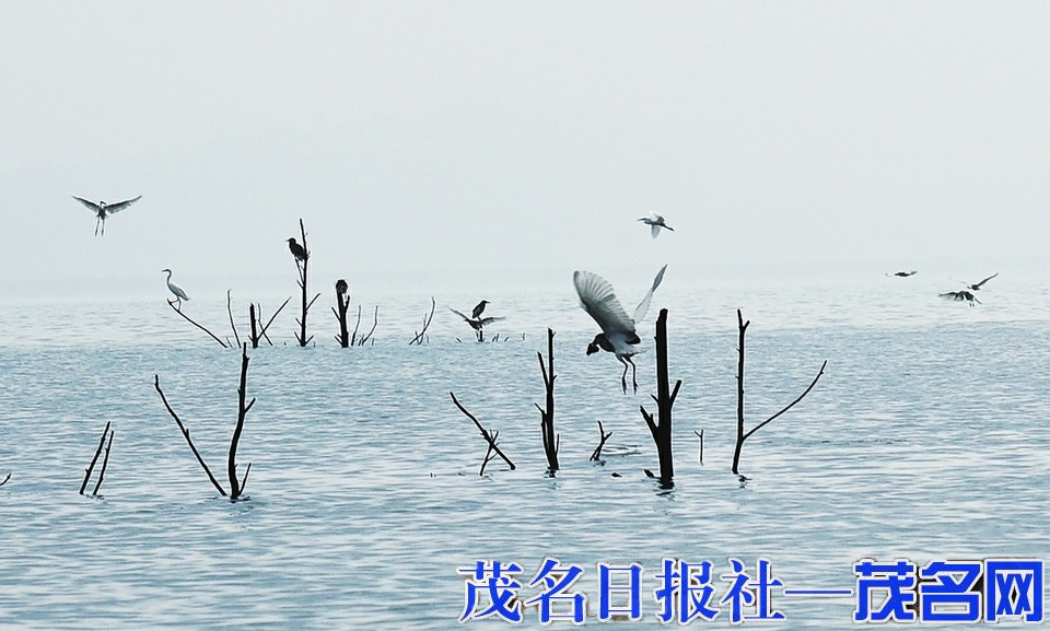 春节过后,乍暖还寒,茂名露天矿生态公园湖面水天一色,一群群鹭鸟站立在水面的枯枝上,时而贴着水面低飞滑翔,时而在空中飞舞,时而俯冲入水中捕食,呈现出一幅幅水墨画般的美景。这是记者昨天在茂名露天矿生态公园南岸古城山村附近水域看到的景像。生态环境持续改善,引来大量鹭鸟在此栖息。 茂名日报社全媒体记者黄信涛摄