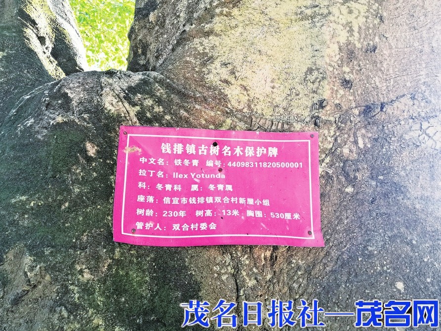 铁冬青树上的铭牌。茂名晚报记者李光耀摄
