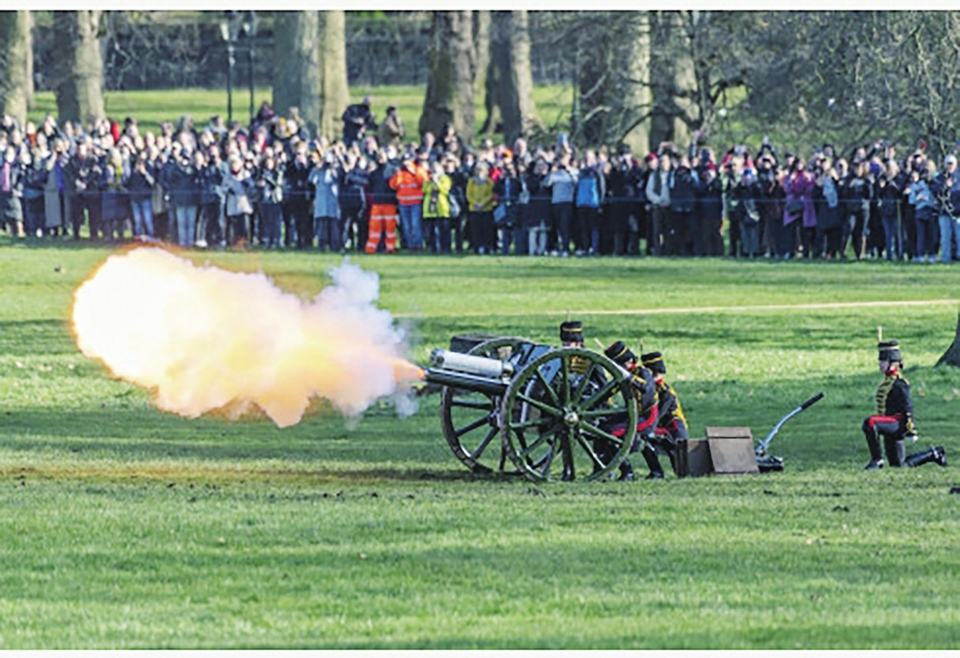 2月7日,英国士兵在伦敦白金汉宫旁的格林公园鸣放礼炮,庆祝女王伊丽莎白二世登基70周年。