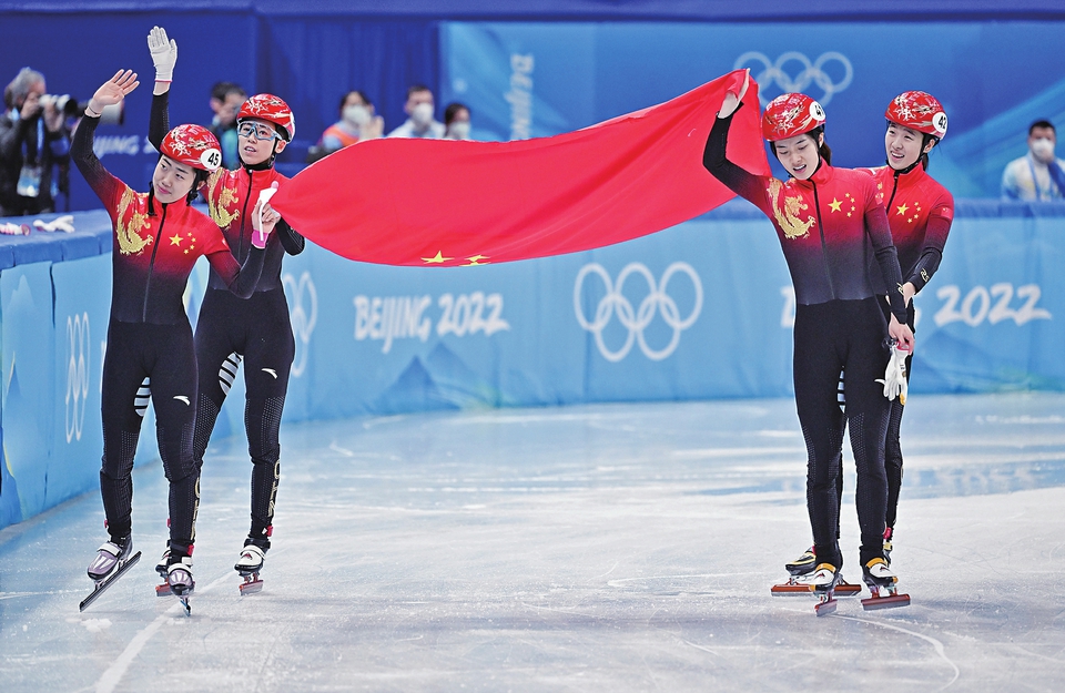 当日,在首都体育馆举行的北京2022年冬奥会短道速滑项目女子3000米接力决赛中,中国队获得季军 (2月13日,中国队选手在比赛后。新华社记者鞠焕宗摄)