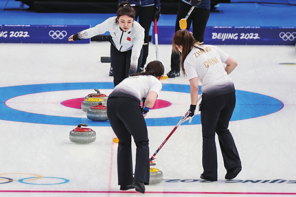 第六局,中国队掌控了比赛主动权,形成四分牵制局面,韩国队旋进后手得一分。第七局中国队如愿“流局”,将后手权保留至下一局。第八局局势稍显复杂,王芮最后一投精准击打为中国队后手赢得宝贵两分,5:4全场第一次取得领先。第九局韩国队希望保留决胜局的后手优势,选择“流局”。第十局,王芮在关键时刻心如止水,打出精彩“双飞”,韩国队队长金恩贞后手旋进得一分将总比分扳平,中国队带着后手优势进入加赛局。