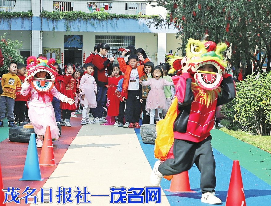 市一幼的孩子们舞狮闹元宵,零距离体验元宵节传统文化。茂名日报社全媒体记者岑稳摄