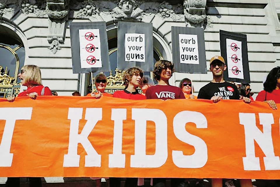 2019年8月17日,在美国旧金山市政厅外,民众在集会上手持标语呼吁联邦政府加强枪支管控。(新华社发,李建国摄)