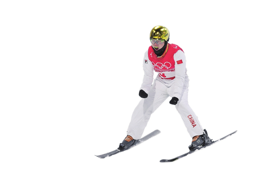 2月16日,中国选手齐广璞完成动作后庆祝。 新华社记者吴壮摄