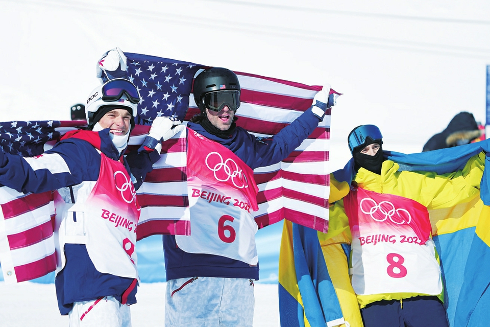 2月16日,获得冠军的美国选手亚历山大·霍尔(中)、获得亚军的美国选手尼古拉斯·戈珀(左)和获得季军的瑞典选手耶斯佩尔·谢德在比赛后庆祝。新华社记者王昊飞摄
