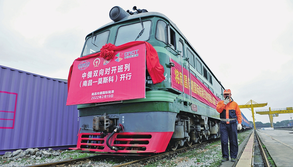 2月19日,2022年江西首列中俄双向对开班列(南昌—莫斯科)在南昌向塘国际陆港准备出发。