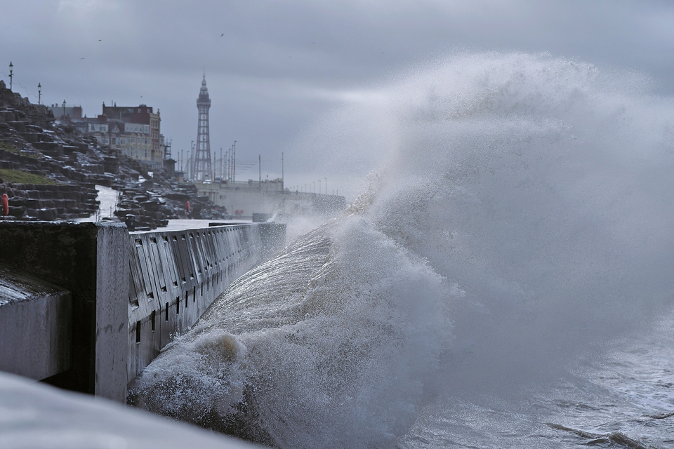 2月18日,在英国布莱克浦,巨浪拍打堤岸。 新华社发(乔恩·休珀摄)