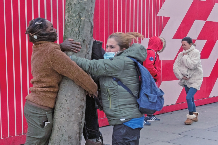 2月18日,在英国伦敦,行人抱住大树以防被风吹倒。