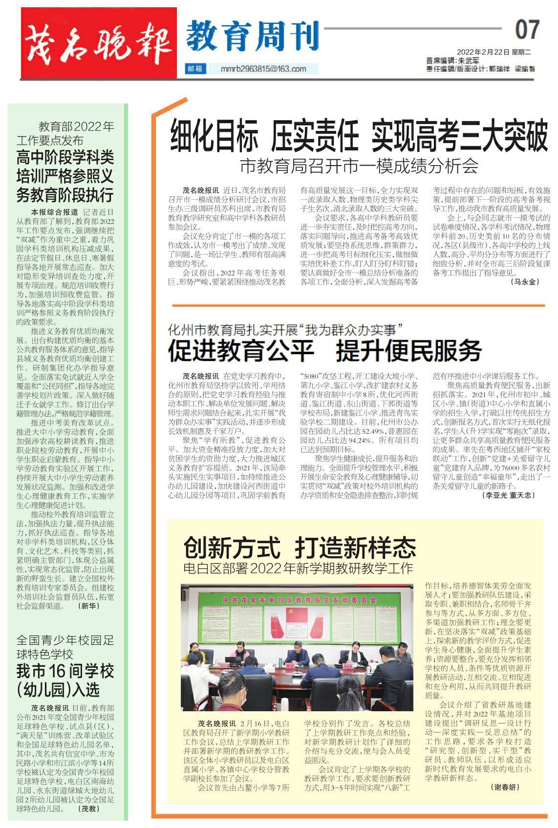 茂名晚报讯日前,教育部公布2021年度全国青少年校园足球特色学校、试点县(区)、“满天星”训练营、改革试验区和全国足球特色幼儿园名单,其中,茂名共有信宜中学、市为民路小学和市江滨小学等14所学校被认定为全国青少年校园足球特色学校,电白区南海幼儿园、水东街道绿城大地幼儿园2所幼儿园被认定为全国足球特色幼儿园。 (茂教)