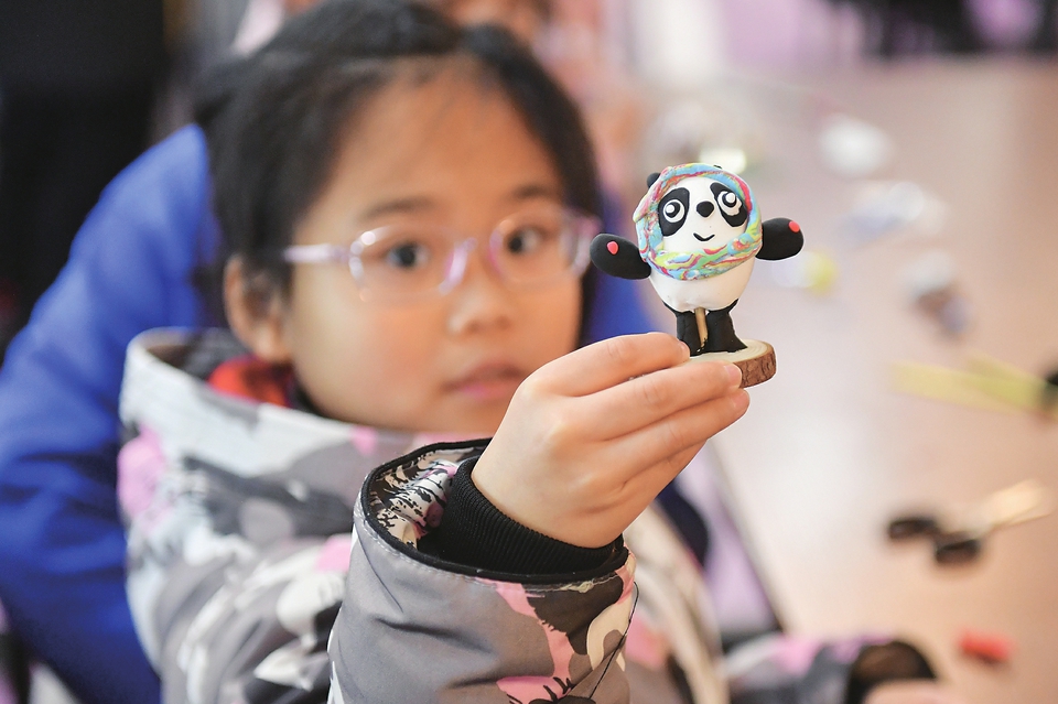 2月13日,在长沙雨花非遗馆,小朋友展示自己捏制的“冰墩墩”。新华社记者陈泽国摄