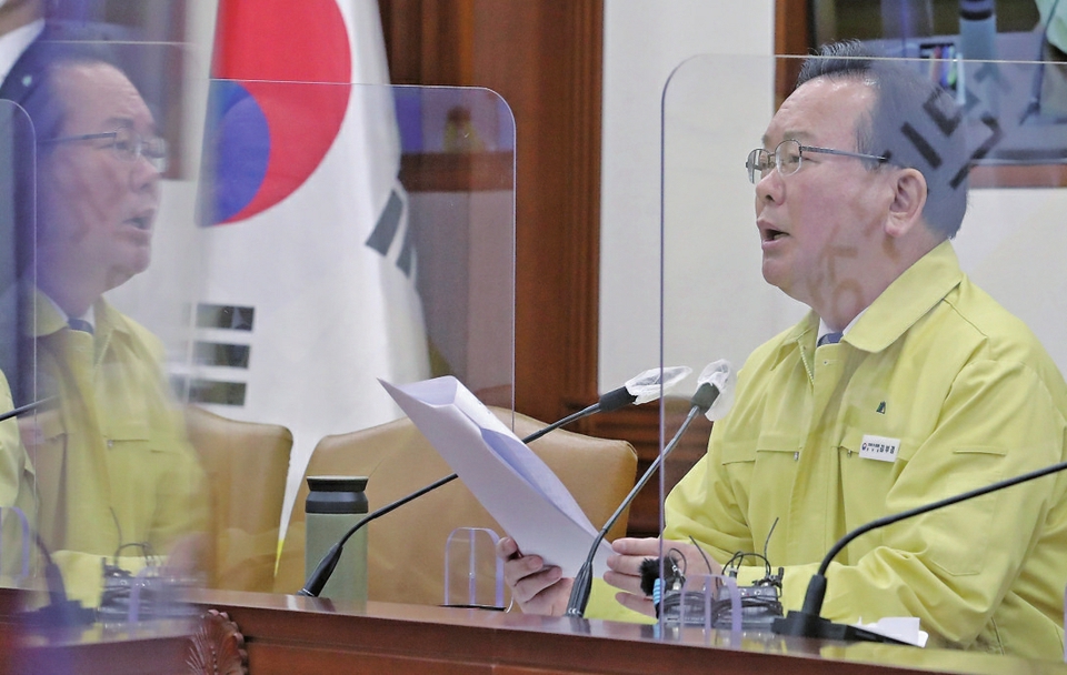 3月2日,在韩国首尔,国务总理金富谦在中央防疫对策本部应对新冠病毒会议上讲话。 新华社/纽西斯通讯社