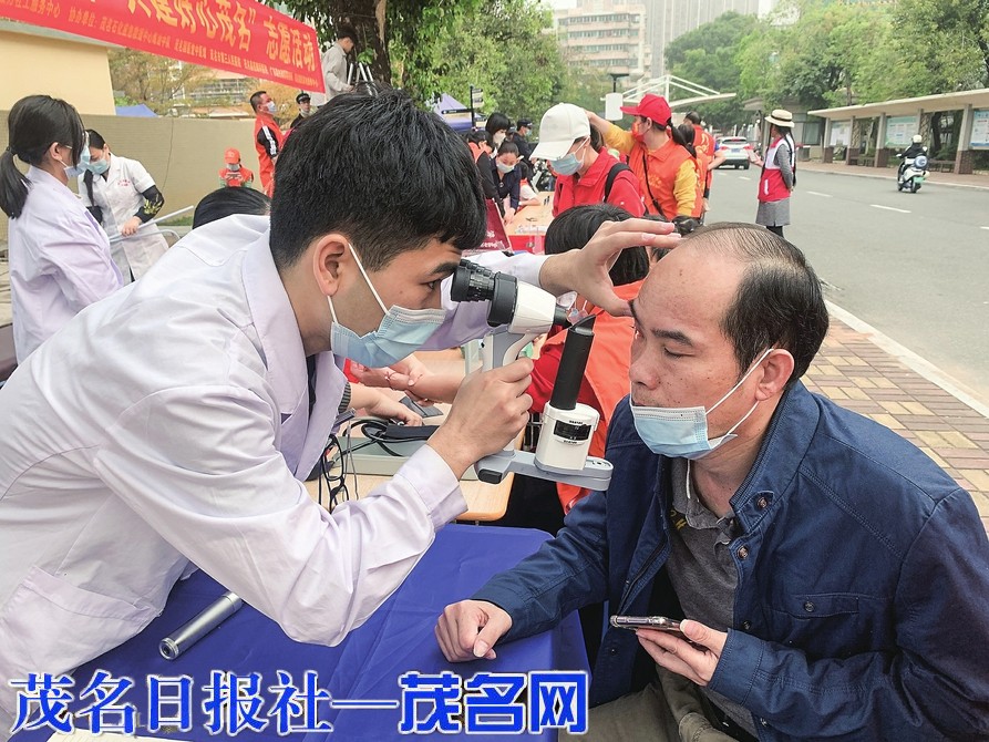 医生为居民检查眼睛。茂名晚报记者潘宇丽摄