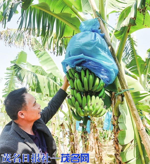 目前,高州市曹江镇溪朗村香蕉长势喜人,一派丰收在望的景象。近日,在溪朗村香蕉种植基地,村民正在检查香蕉果穗的生长情况。