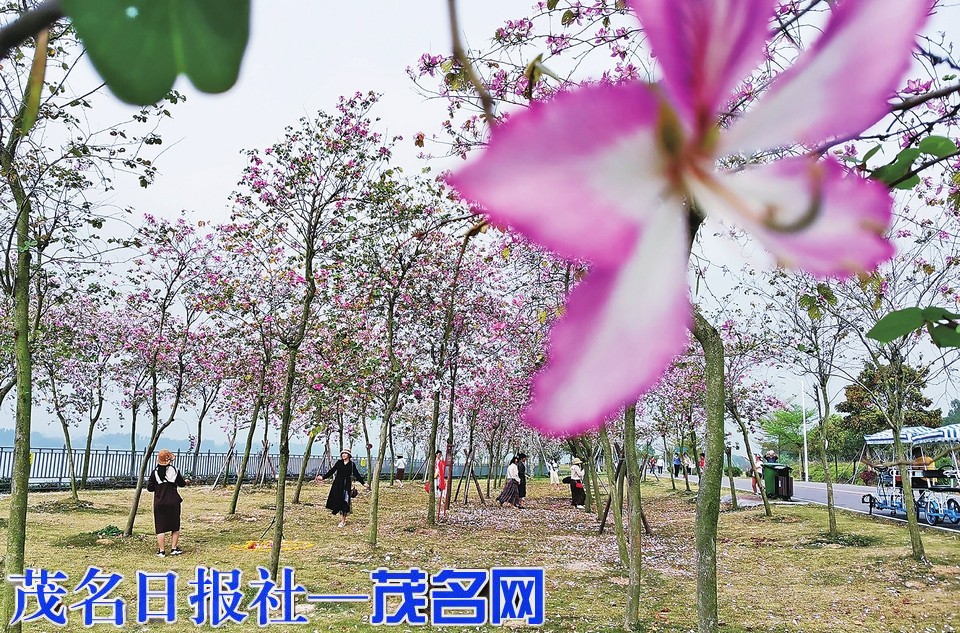 连日来,在茂名露天矿生态公园,迎风绽放的宫粉紫荆花成为好心湖畔新的打卡点,吸引了众多市民观赏拍照。茂名日报社全媒体记者岑稳摄