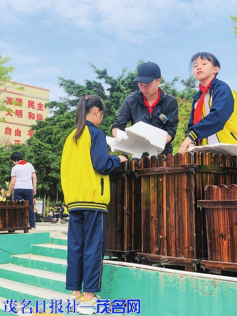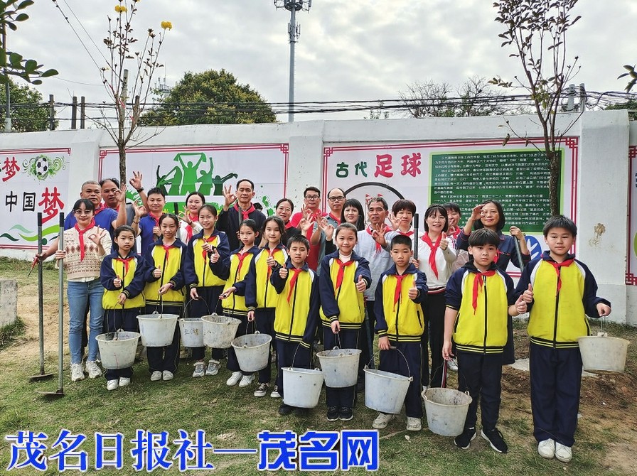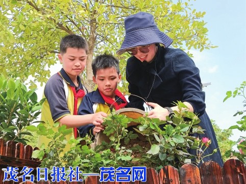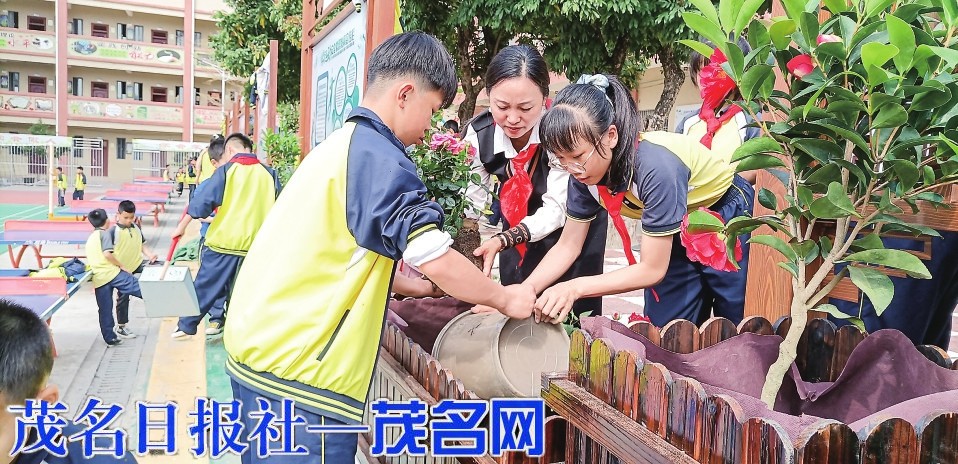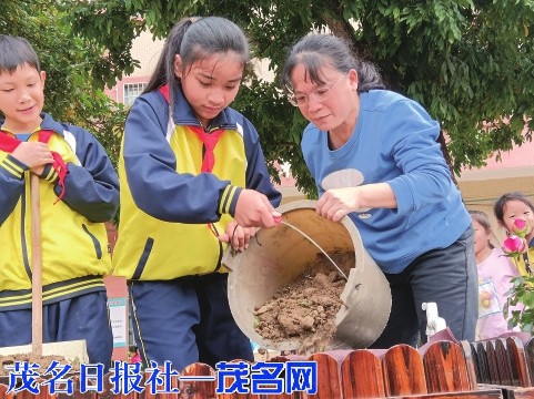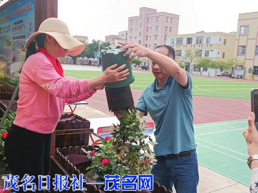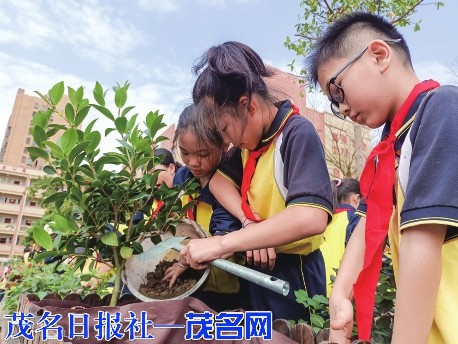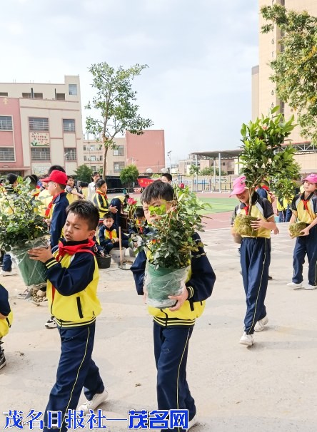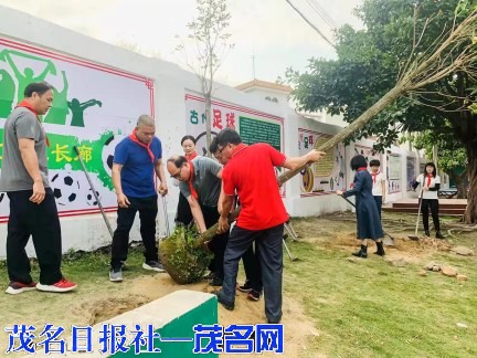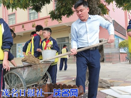 当天上午,茂南区山阁镇中心小学的校园里热火朝天,到处能看到忙碌的身影。原来,是老师和同学在忙着装扮校园。他们以中队为单位,共同在花圃里种下可爱的花苗。看,老师们挥动着锄头,挥汗如雨;同学们搬运泥土、脱盆、回泥、浇水……他们辛苦却快乐着。