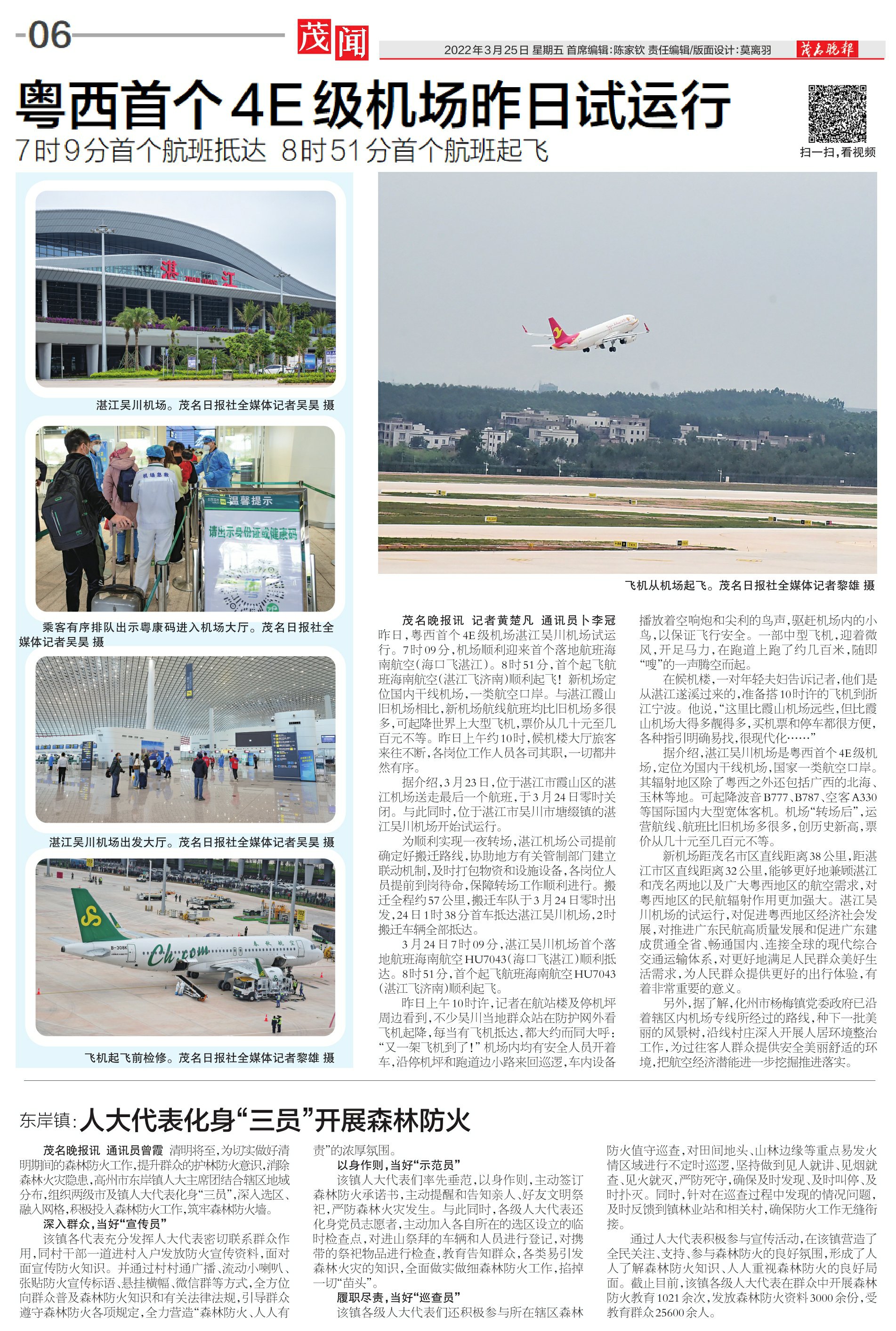 3月24日7时09分,湛江吴川机场首个落地航班海南航空HU7043(海口飞湛江)顺利抵达。8时51分,首个起飞航班海南航空HU7043(湛江飞济南)顺利起飞。