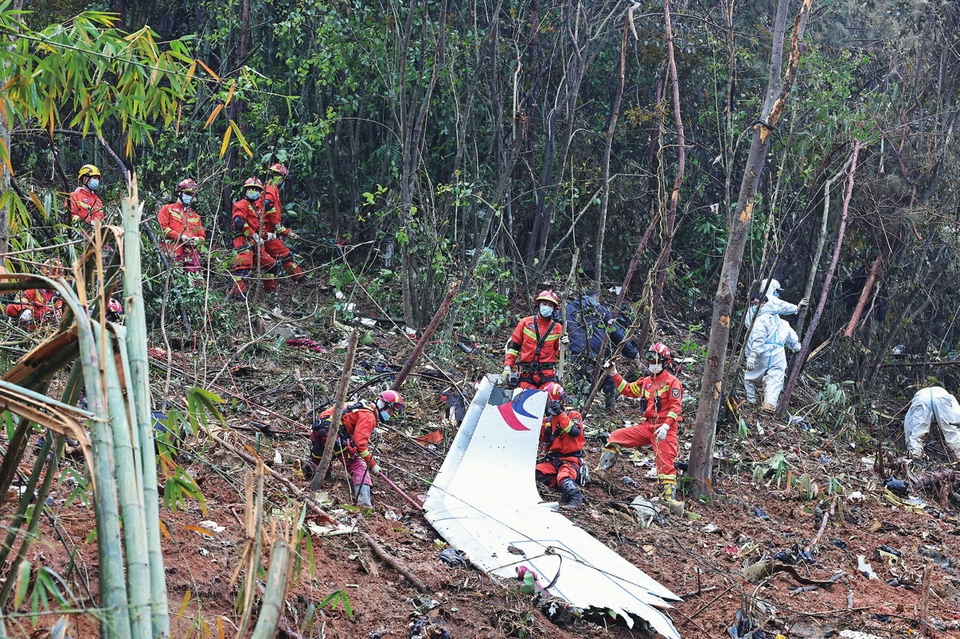 3月23日下午,在广西藤县埌南镇莫埌村东航坠机事故现场,搜救人员发现了MU5735航班的一部黑匣子。