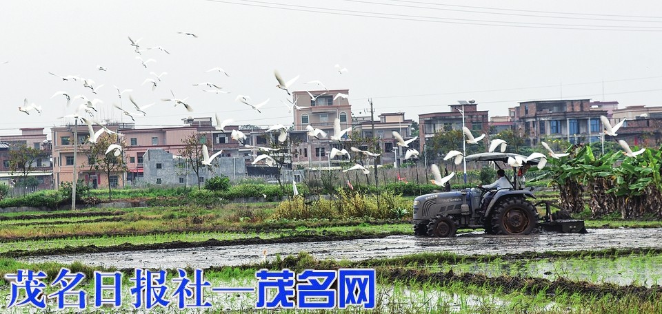 大群白鹭围着耕作的农机觅食。茂名日报社全媒体记者黄信涛摄