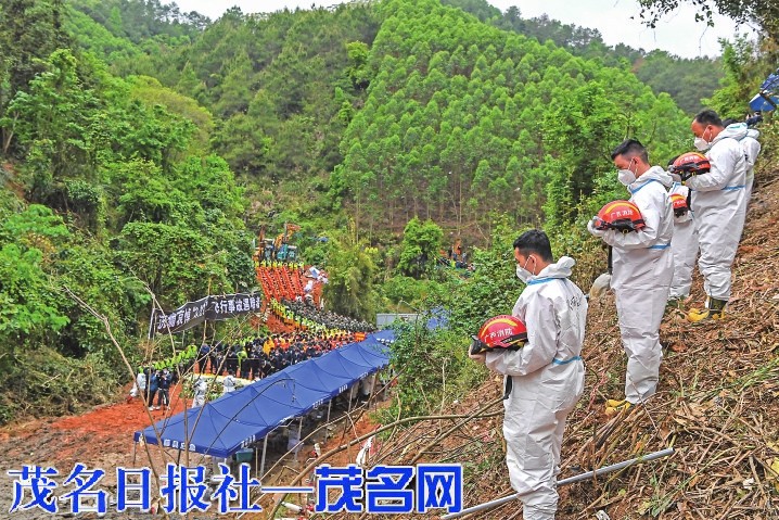 27日14时许,哀悼活动开始,全场鸣笛,“3·21”东航MU5735航空器飞行事故国家应急处置指挥部全体人员、事故现场搜救人员等面向遇难飞机方向肃穆而立,默哀三分钟,以此寄托对遇难者的哀思。