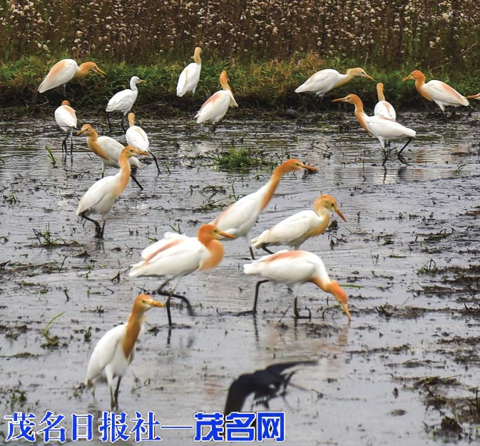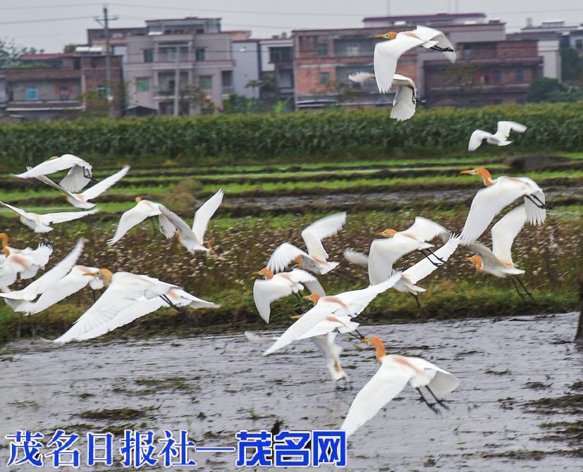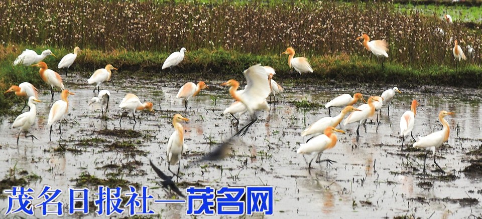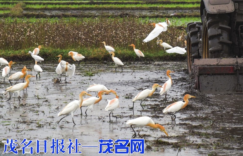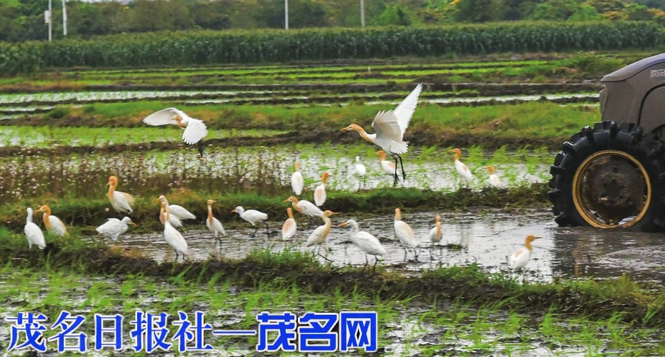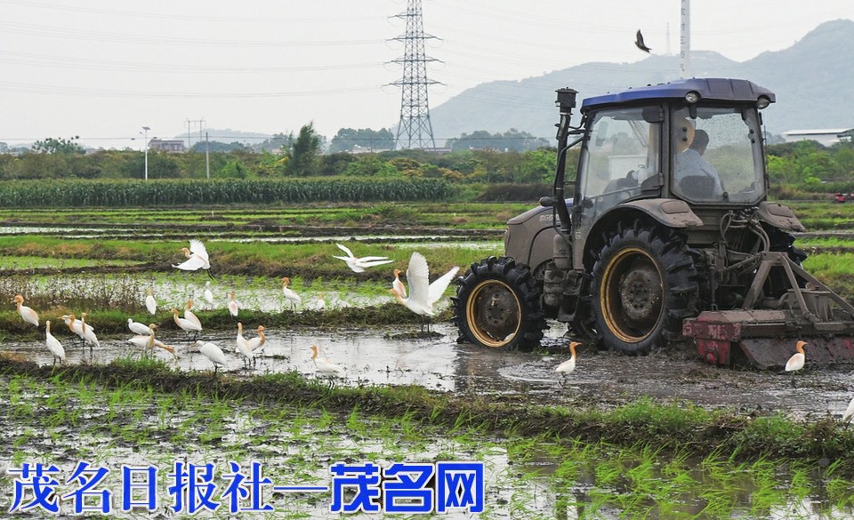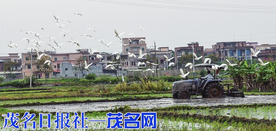 春耕时节,我市各地乡村田野一派繁忙。昨天,记者在茂南区羊角镇桥头村田野看到,农机在田里来回穿梭耕作,大群白鹭围着耕作的农机觅食,时而追着犁头翻飞,时而低飞盘旋,时而在田间漫步,时而相互嬉闹,好一幅白鹭闹春耕美景图。 茂名日报社全媒体记者 黄信涛摄