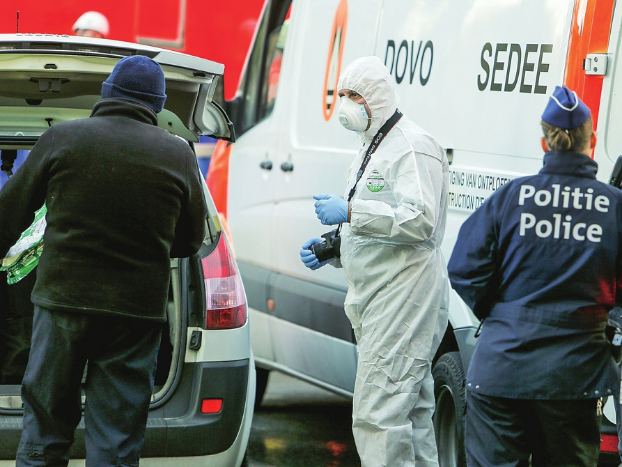 2015年11月26日,医护人员在比利时首都布鲁塞尔的大清真寺外工作。布鲁塞尔大清真寺内26日发现装有白色粉末的可疑包裹。警方疏散了大清真寺内的人员,工作人员携带检测炭疽杆菌的设备到场调查。 (新华社记者周磊摄)