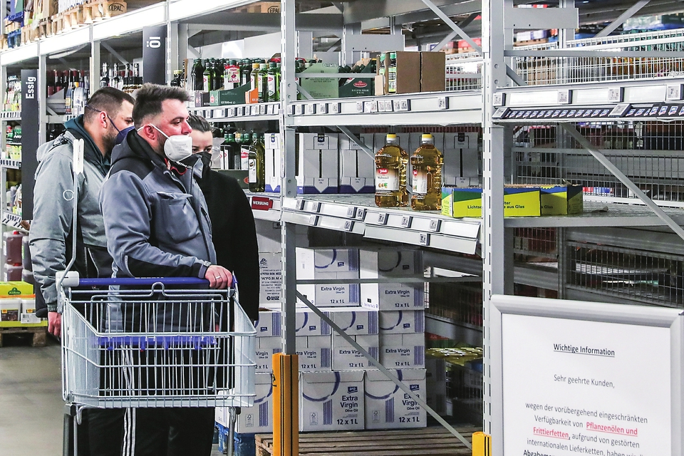 3月26日,在德国首都柏林的一家超市,顾客站在商品短缺的食用油货架前。随着西方不断升级对俄制裁,能源价格上涨也波及食品、日用品等与生活息息相关的领域。 新华社记者单宇琦摄