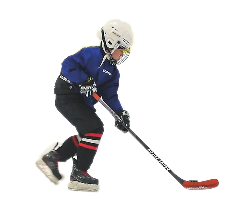 图为正在练习冰球的小球员。