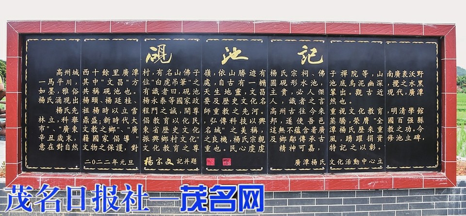 茂名晚报村记者何康源池水清澈透明,池底里的泥却浓黑如墨,搅动整池水如同墨汁……去年,高州市宝光街道广潭村在乡村振兴建设中,对该村自古就有的砚池遗址进行了修复,修复后的砚池不但保留了池水搅之如墨的特点,水位还比周边农田高出半米以上,让人啧啧称奇。