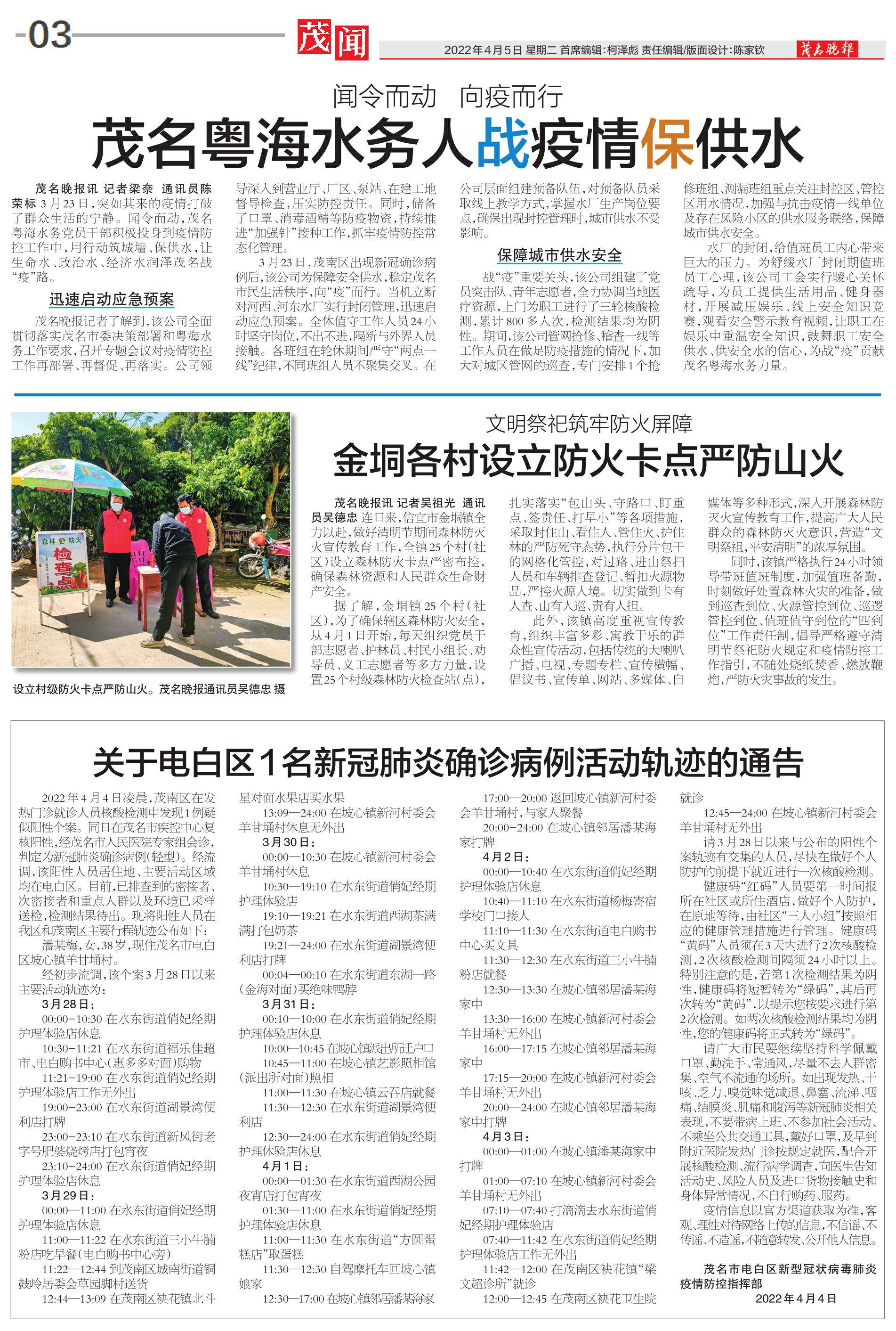 2022年4月4日凌晨,茂南区在发热门诊就诊人员核酸检测中发现1例疑似阳性个案。同日在茂名市疾控中心复核阳性,经茂名市人民医院专家组会诊,判定为新冠肺炎确诊病例(轻型)。经流调,该阳性人员居住地、主要活动区域均在电白区。目前,已排查到的密接者、次密接者和重点人群以及环境已采样送检,检测结果待出。现将阳性人员在我区和茂南区主要行程轨迹公布如下: