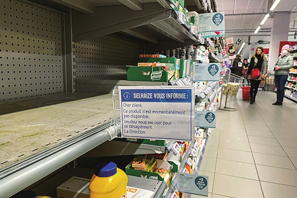 4月1日,在比利时布鲁塞尔一家超市的食用油货架上,部分商品出现短缺情况(手机照片 。)(新华社记者郑焕松摄新华社记者郑焕松摄)