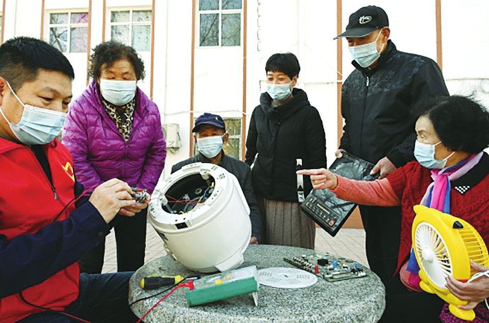 2022年3月5日,在河北省邯郸市丛台区光明桥街道电厂社区,志愿者在“学雷锋、树新风”志愿服务活动上为居民免费维修小家电。 (新华社发)
